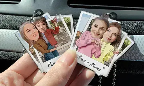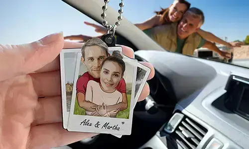 Your mirror pendant car you get with photo of your friends or family. Simply upload your photo and type in your desired text!