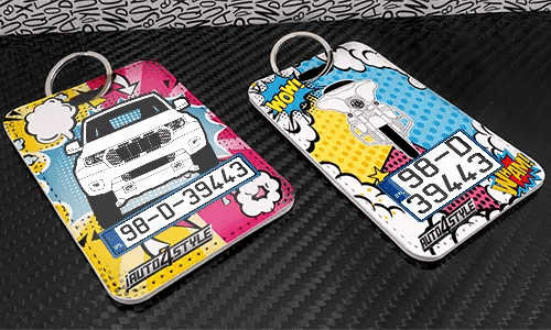 Crea una cadena para espejo retrovisor genial con nosotros. Tienes varias opciones de diseño disponibles: decides el modelo del vehículo mostrado, incluyendo el color, el número de matrícula y el diseño cómico que lo rodea.