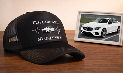 Dos gorras negras con coche deportivo y diseño de latido, texto FAST CARS ARE MY ONLY VICE arriba y abajo de la gráfica