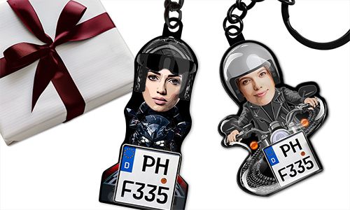 Diesen Schlüsselanhänger für Motorrad bekommst du mit deinem Foto und Kennzeichen im coolen Design. Wähle nach deinen Vorlieben!