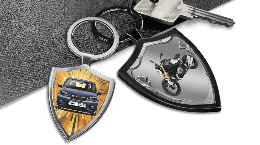 Våre dyktige produktgrafikere har laget en rekke stilige design for produktene våre. Bestem selv hvilket motiv som skal pryde nøkkelringens skilt!