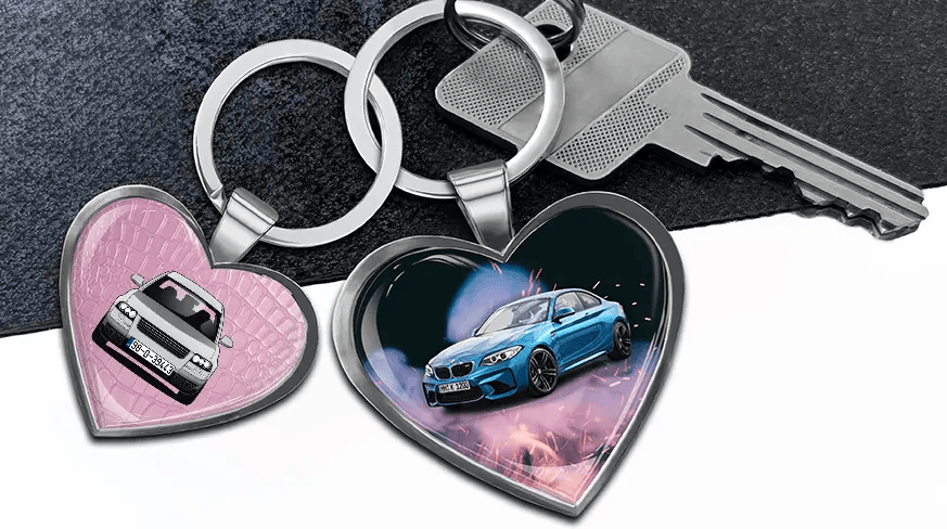 Du kan få din hjärtformade nyckelring med önskat motiv (bil eller foto) i en snygg design. Många designvarianter finns i sortimentet. Välj enligt dina önskemål.