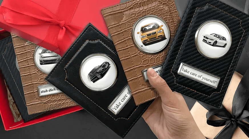 Beställ en personlig present till din pappa: fordonsdokumenthållare med din önskade bil och egen text!