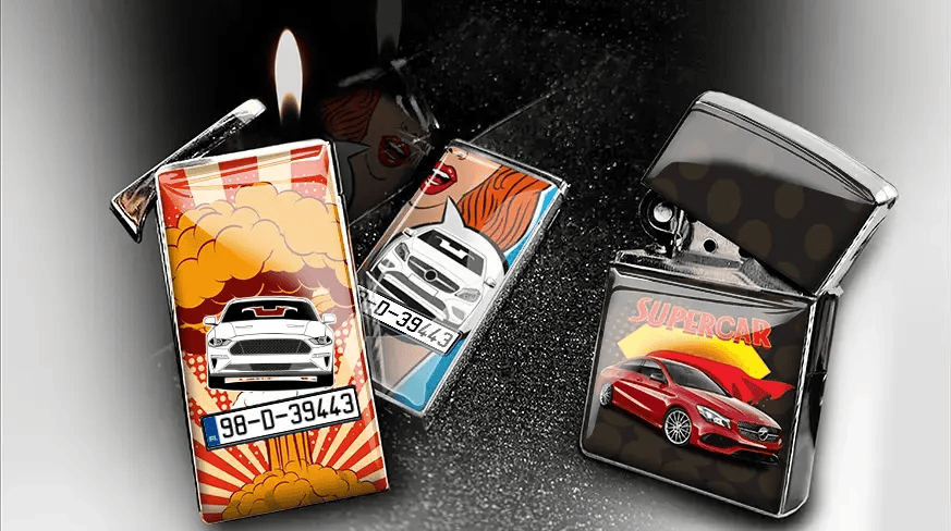Få din individuella tändare med det motiv du väljer (bil eller foto) i en cool design. Många designvarianter i vårt sortiment. Välj efter dina preferenser.